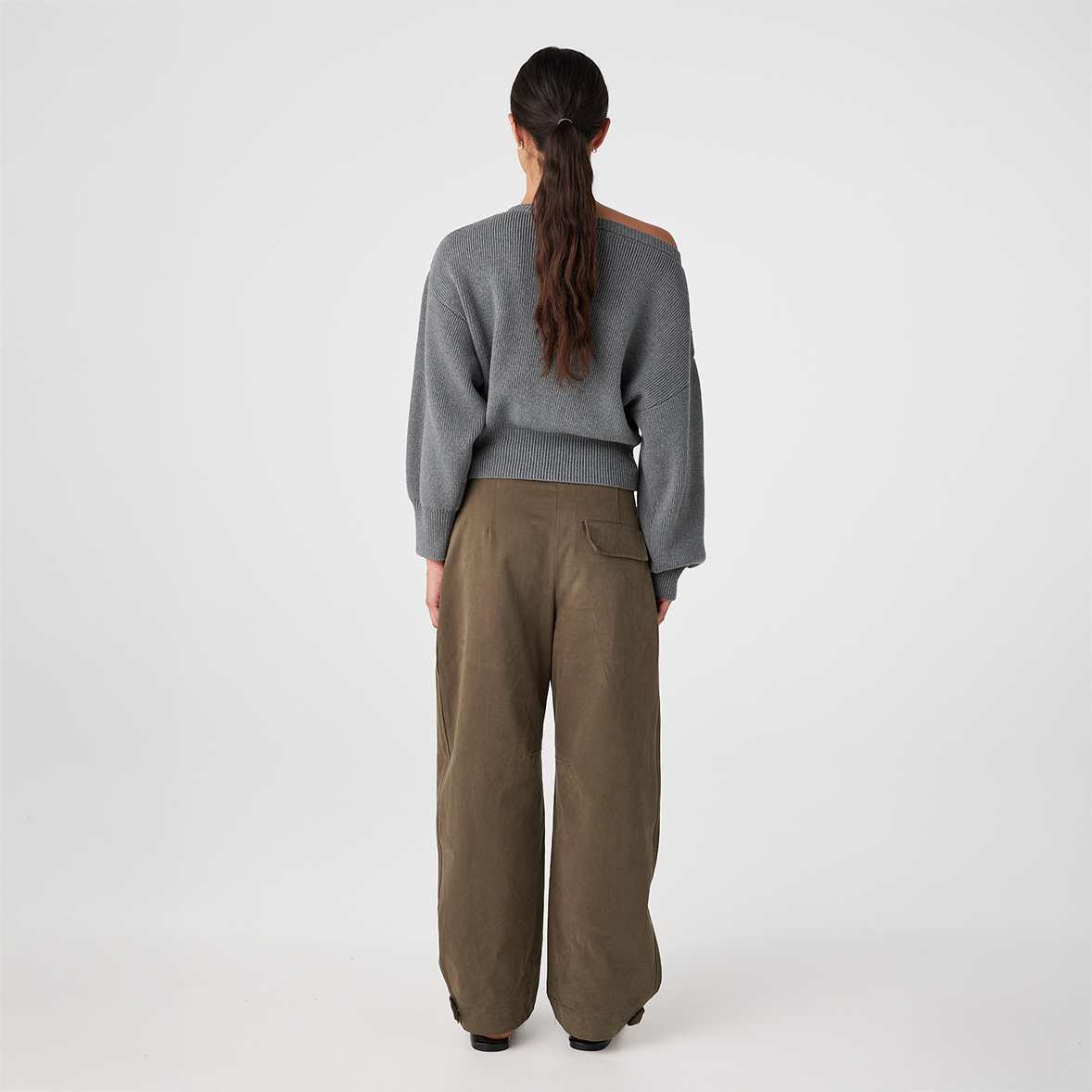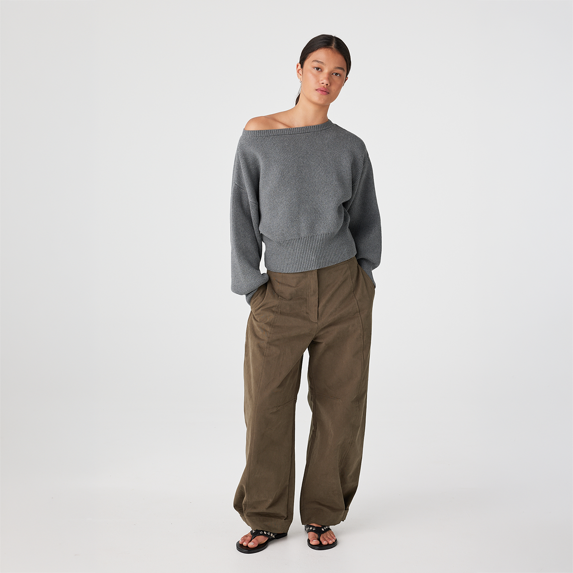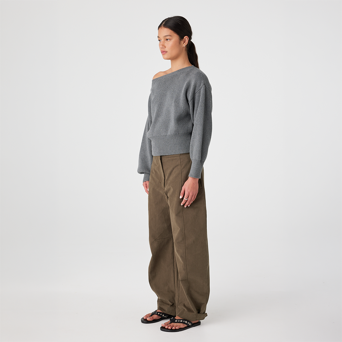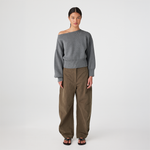 The Soren Sweater is crafted from an organic cotton blend that feels breathable while maintaining structure. The wide neckline is designed to sit slightly open and can be styled on the shoulder or eased off one shoulder for a relaxed look.