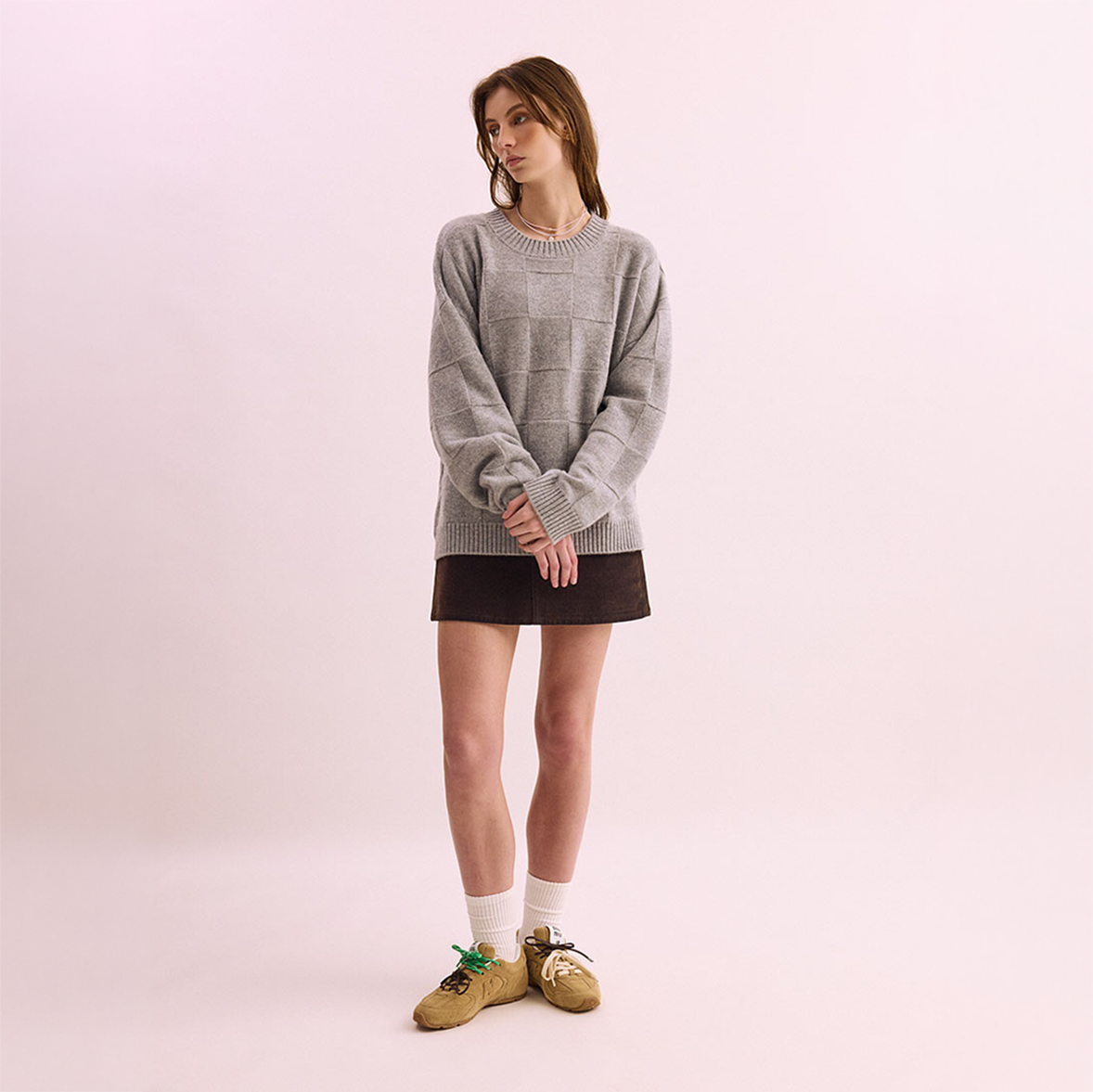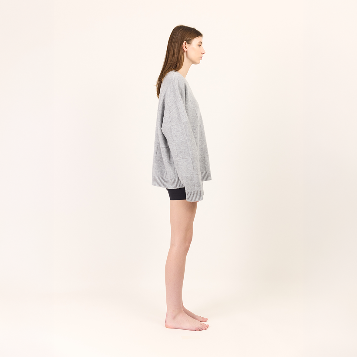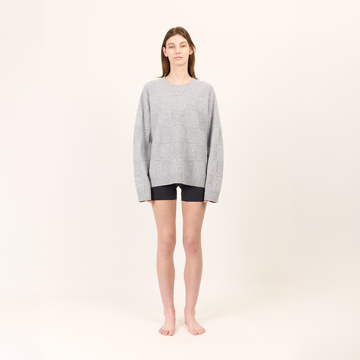 The Squares Crew is crafted from fine merino wool in a soft silver marle tone. A tonal square knit pattern introduces quiet texture while maintaining a clean, minimal finish.