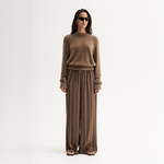 The Tate Knit Top is cut with a gently relaxed shape that drapes softly through the body, finished with a clean crew neckline and full-length sleeves. The silhouette feels easy and unstructured, with a slight blouson effect at the hem that adds softness to the overall shape.