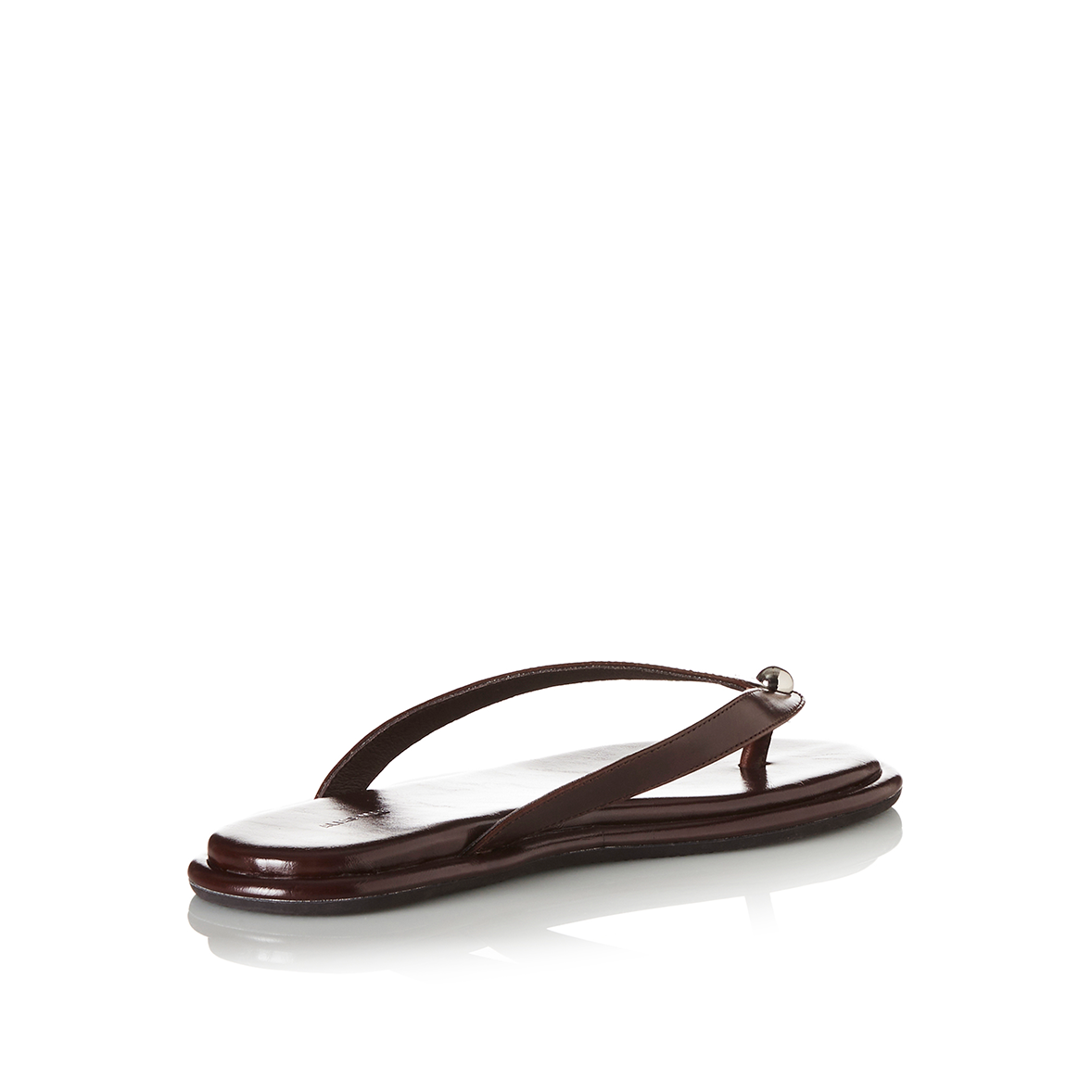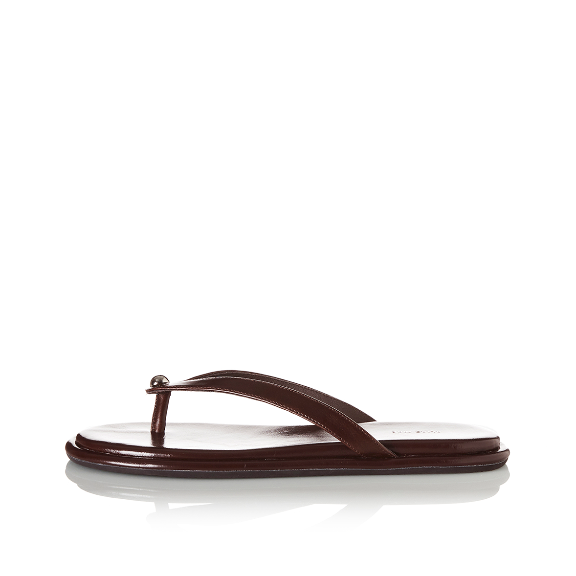 The Tula Sandal in Walnut by Alias Mae is a minimal thong slide with subtle stud detailing in warm walnut, an easy everyday option.